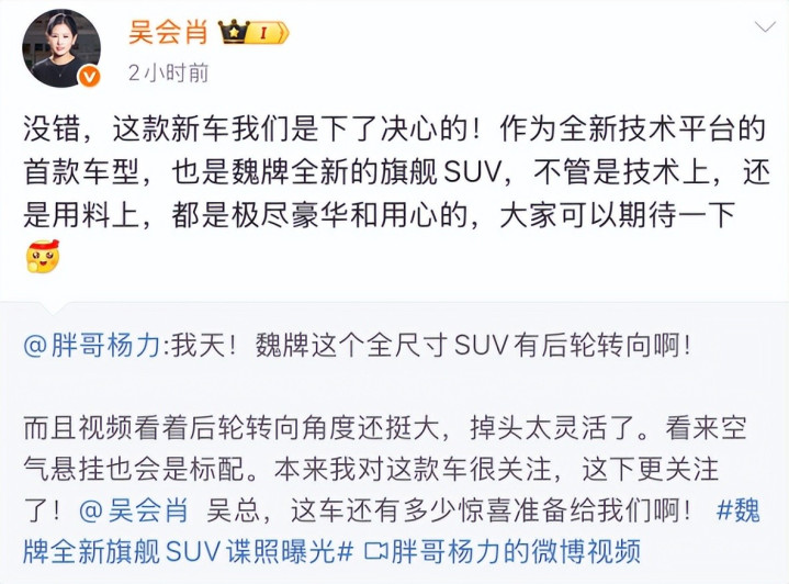 最后,据长城汽车CTO吴会肖在个人社交平台透露,长城这款旗舰SUV不仅将配备后轮转向系统,还会全系标配空气悬架,以此来强化用户在舒适性上的用车感受和体验。
